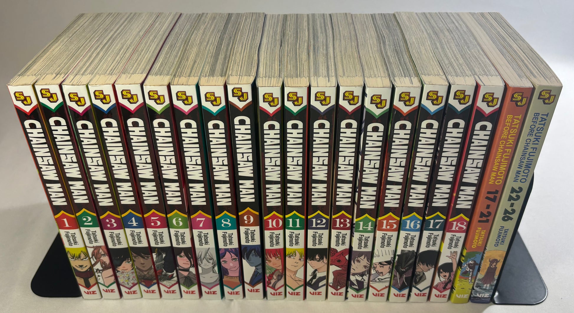 A used set of Chainsaw Man volumes 1-18 with the one shots 17-21 and 22-26 by Tatsuki Fujimoto. Pictures reflect condition.