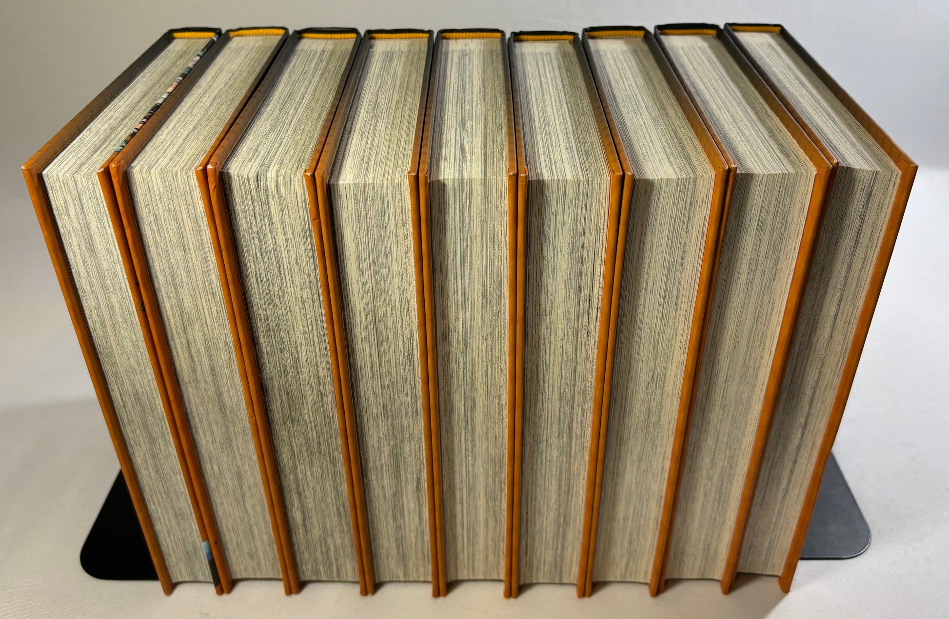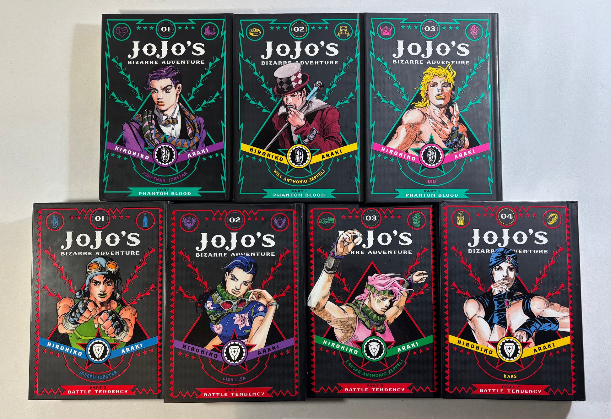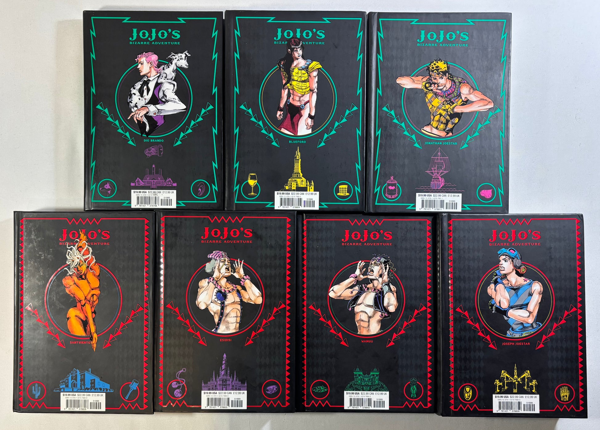 A used set of Jojo's Bizarre Adventure Hardcovers parts 1-5 complete. There is minor wear, yellowing, and some cover damage pictured.