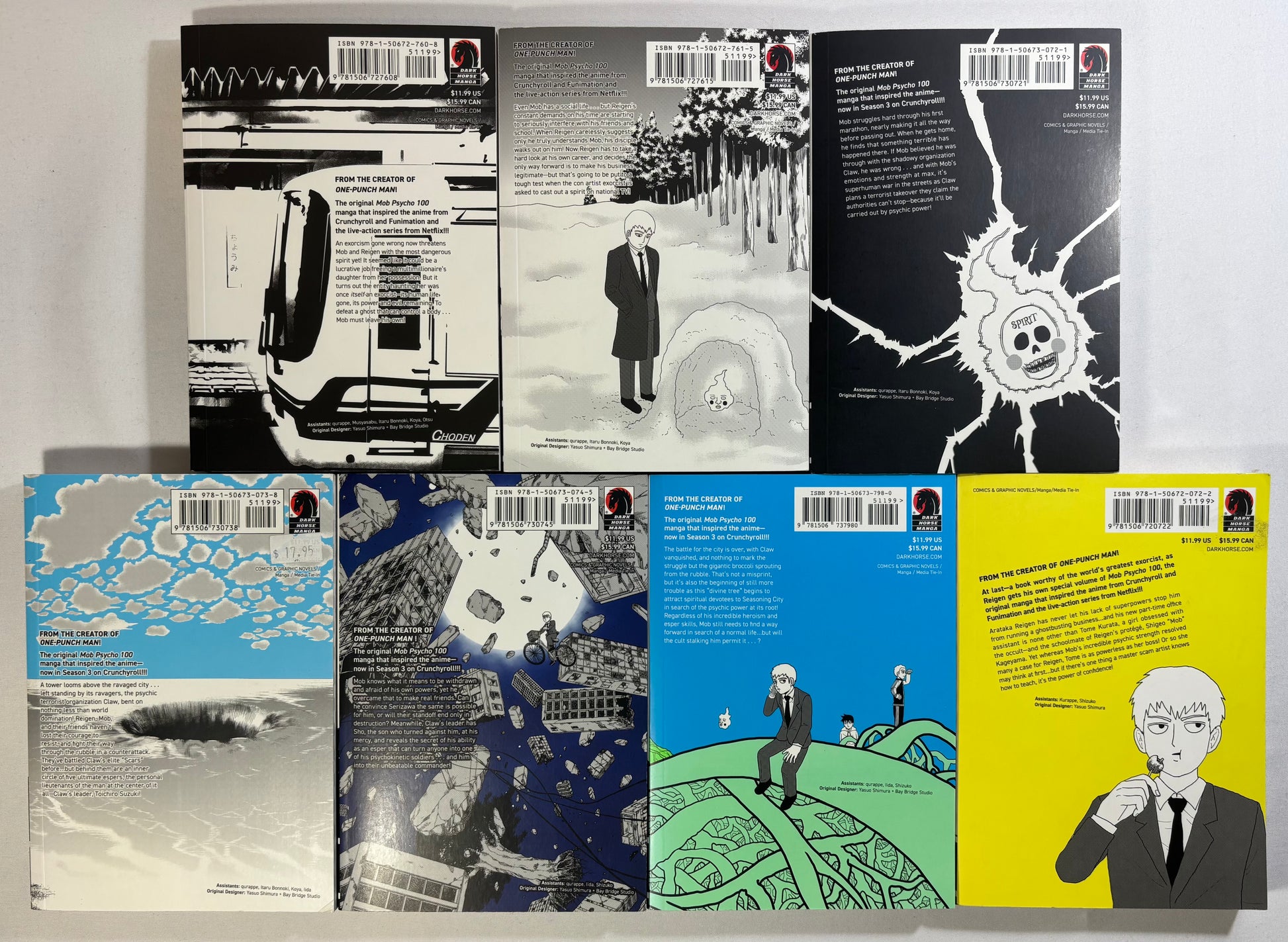 A used set of Mob Psycho 100 volumes 1-13 with the side story Mob Psycho 100 Reigen. Pictures reflect condition.