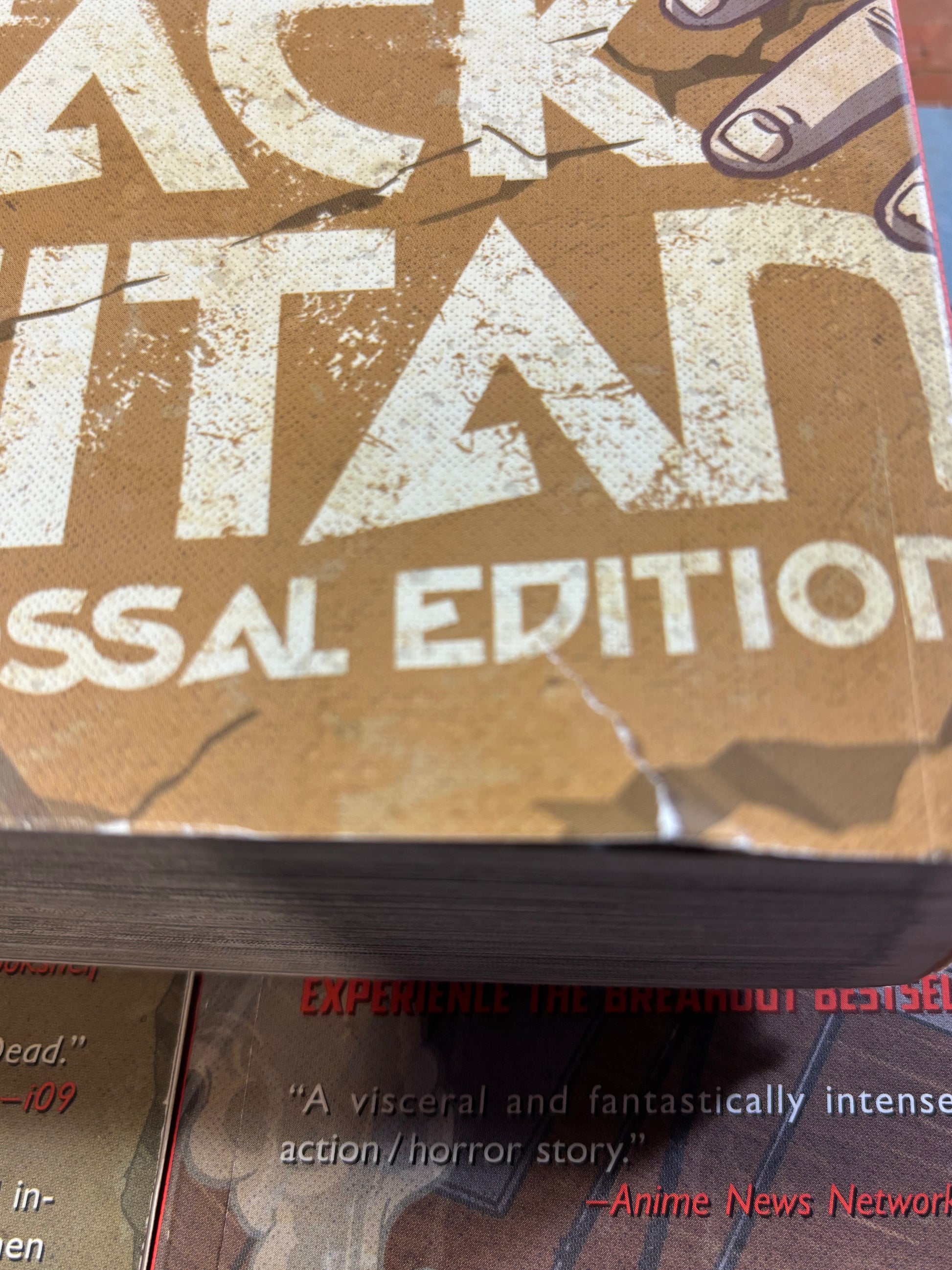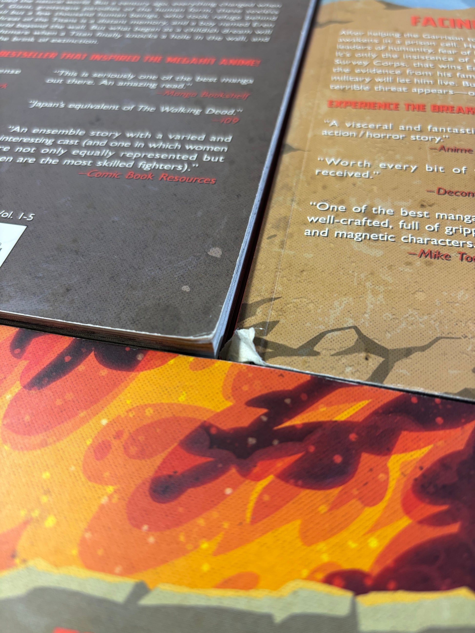 A used set of Attack on Titan Colossal Edition 1-7 published by Kodansha. There is very notable shelfwear, creases and tears. There is also a crease in the spine of volume 3. Pictures reflect condition and more notable damage is pictured.